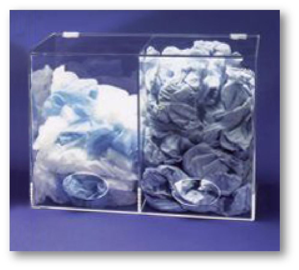 This large capacity two compartment dispenser is ideal for shoe covers, gloves, bouffants, hair nets, beard covers, hooks, etc. Keep an assortment of different disposables in one location with just one cleanroom dispenser. Each compartment has its own dispenser opening with radius edges for a smooth finish.